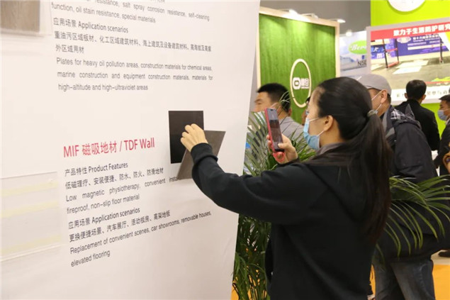采用不同花色的六边形地板,铺装展位地面;更多花色地板上墙,展示铺装效果与产品应用细节。